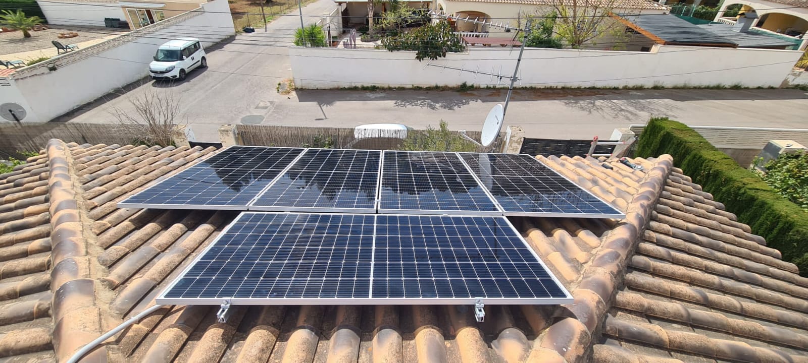 Instalación fotovoltaica de autoconsumo residencial en Lliria, Valencia. Está compuesta por 10 paneles monocristalinos perc de la marca Ja solar de 455 Wp, 5 paneles con estructura coplanar orientados al sur y 5 paneles con estructura coplanar orientada al este. El inversor es híbrido de 5kWn y su entrada de CC máxima recomendada es de 7.5 kWp, produce aproximadamente 6.552 kWh anuales, generando al cliente un gran ahorro en factura.